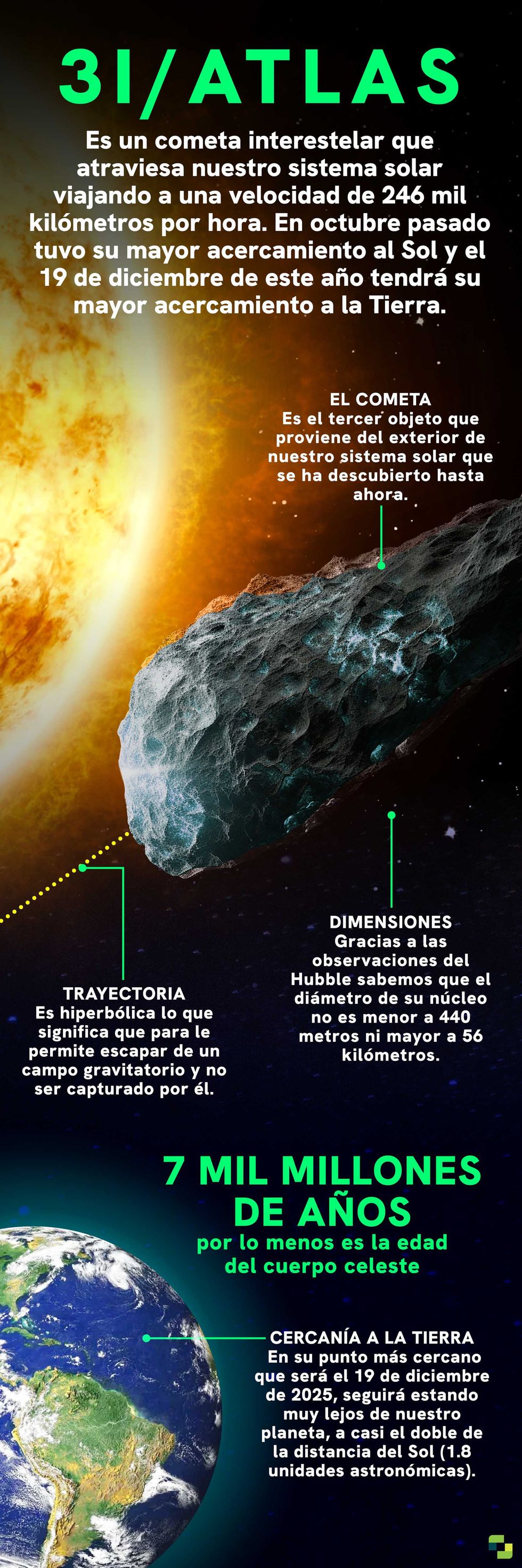 Esto indica que el cometa expulsa partículas de distintos tamaños, lo que refuerza que sus características son inusuales pero explicables con física cometaria conocida.