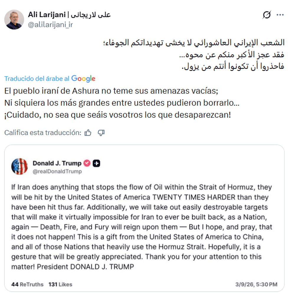 “A Irán no le asustan sus amenazas vacías. Otros más poderosos que usted intentaron eliminar la nación iraní y no lo consiguieron. ¡Cuídese usted de no ser eliminado!”, escribió Larijani.