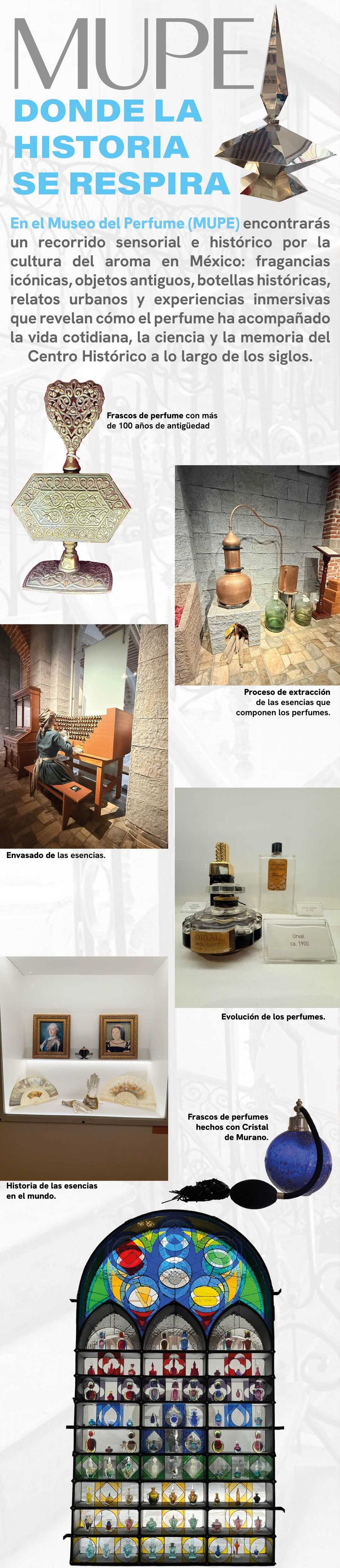 Hoy, el Museo del Perfume (MUPE) se consolida como un espacio único dentro del panorama cultural del Centro Histórico de la Ciudad de México, al proponer una lectura sensible del pasado a través del olfato, uno de los sentidos más íntimos y evocadores. Más que un museo, el MUPE es un punto de encuentro entre historia, arte, ciencia y memoria, donde el perfume se entiende como patrimonio cultural intangible y vehículo de identidad. Visitarlo es recorrer siglos de tradición urbana, descubrir la huella de las boticas y perfumerías que marcaron la calle Tacuba y reconocer cómo los aromas también narran la historia de México, invitando al visitante a mirar —y oler— el pasado desde una experiencia profundamente cultural y contemporánea.