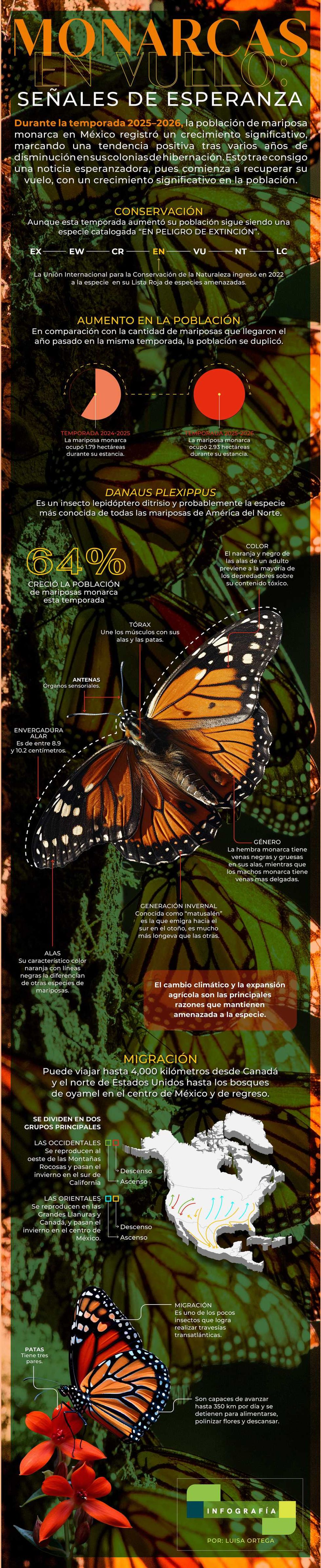 En vísperas de la primavera, una de las migraciones más emblemáticas del planeta trae consigo una noticia alentadora: la población de mariposa monarca en México mostró una recuperación significativa durante la temporada de hibernación 2025-2026.